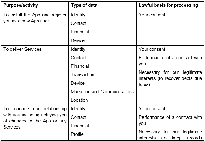 When you consent to providing us with your personal data, we will also ask you for your consent to share your personal data with the third parties set out below for the purposes set out in the table