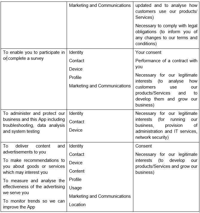 • Any of the services accessible through the App (Services) that are available on the App Site or other sites of ours (Services Sites). This policy sets out the basis on which any personal data we collect from you, or that you provide to us, will be processed by us. This App is not intended for children and we do not knowingly collect data relating to children. Please read the following carefully to understand our practices regarding your personal data and how we will treat it.